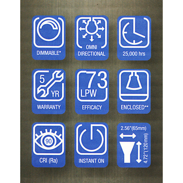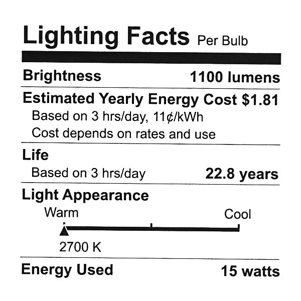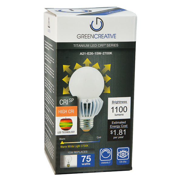 A21 E26 15W 2700k 90 CRI 120V Dimmable 1100 Lumens 75w equal Enclosed rated.