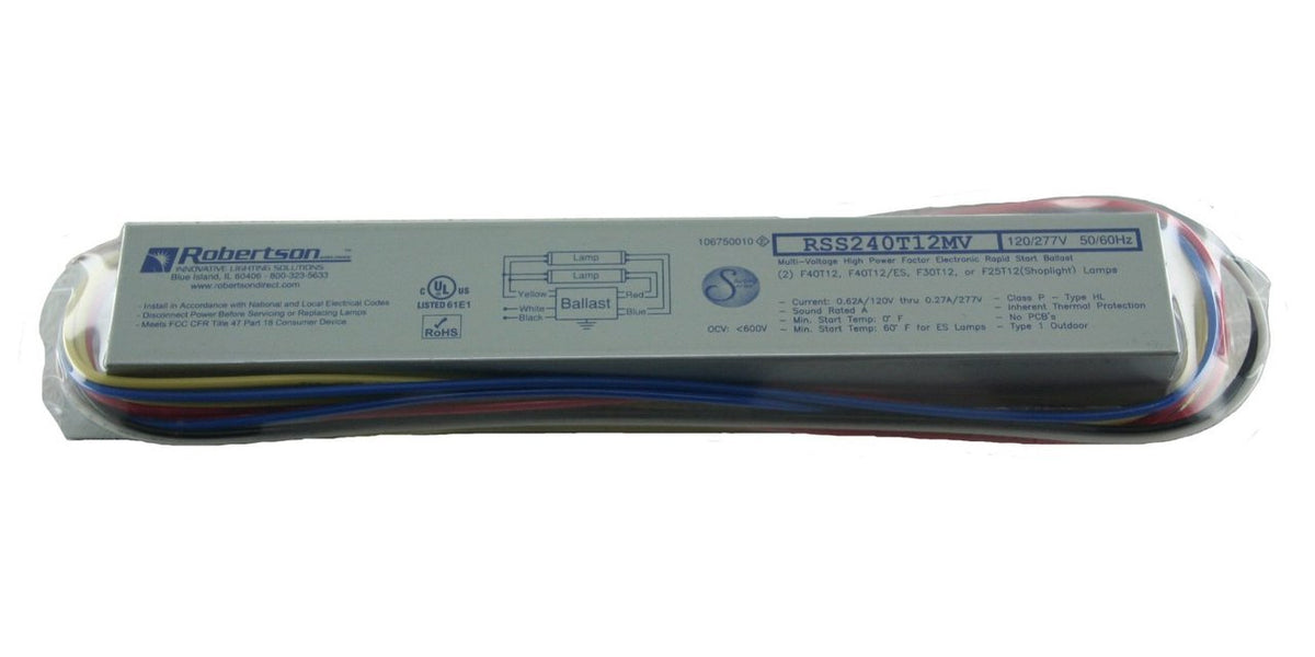 The Robertson RSS240T12MVIP electronic ballast operates two (2) F40T12 lamps 120-277 at 120V This ballast is great for areas that require normal lighting! Rapid start ballast is typically used in offices, board rooms, and retail. Also operates F30T12, and Fluorescent lamps.