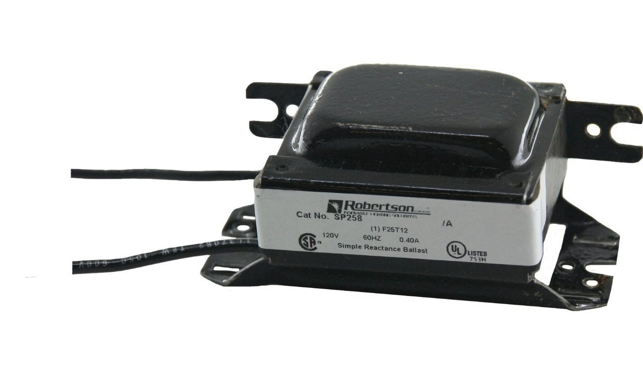 The Robertson SP258 /A is a Magnetic Ballast that operates (1) F25T12 lamp 120 at 120V This ballast is great for areas that require normal lighting! Armed with a Pre-heat starting method, this ballast is used in office, board rooms, and retail. Also operates Fluorescent lamps.